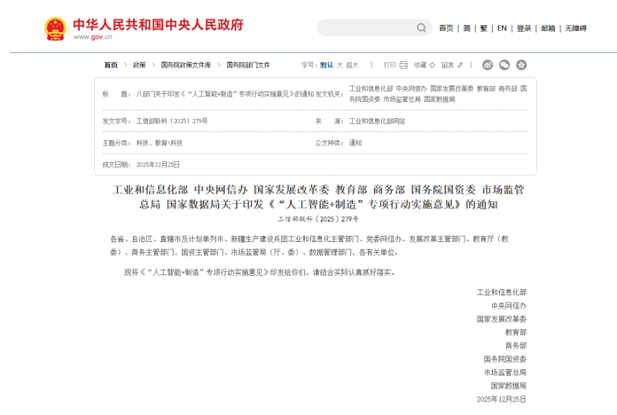 近期,工业和信息化部、中央网信办、国家开展改革委、国务院国资委、市场监管总局、国家数据局等八部门联合印发《“人工智能+制造”专项行动实施意见》(以下简称《意见》)。